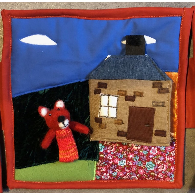 Renard, marionnette à doigt, a une maison à la campagne. Dans sa maison, son lit, sa table avec un livre et un tableau représentant un oiseau... Un jardin potager. Le renard serait-il végétarien ? une mare et des arbres pour se cacher et même une balançoire ! Et un petit tour en montgolfière pour admirer le paysage...