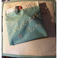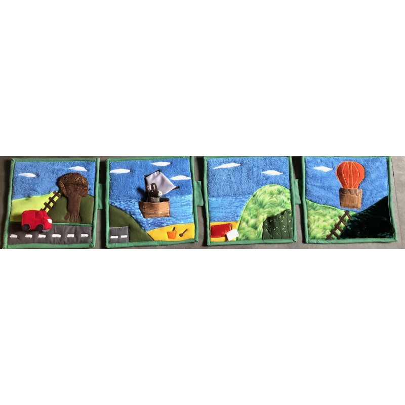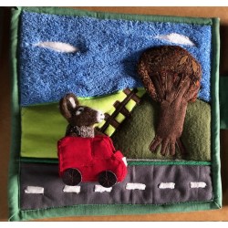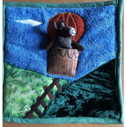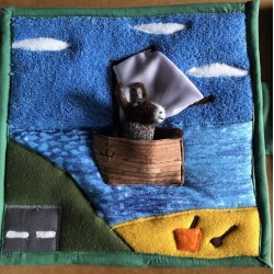 Le livre se replie mais peut aussi devenir un tableau tout en longueur en insérant des baguettes dans les passants à l'arrière du livre. Marionnette en laine feutrée et tricot, pochette brodé pour y "ranger" l'âne. Livre-tableau unique... qui est parti naviguer du côté de Sète.