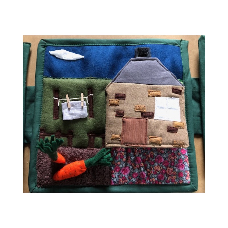 Livre-tableau de 4 pages en tissu. Chaque page mesure 28 cm sur 28 cm.