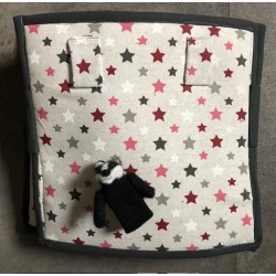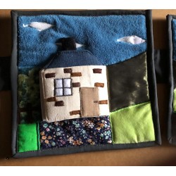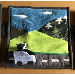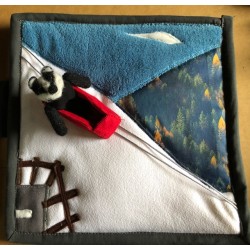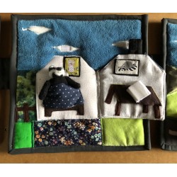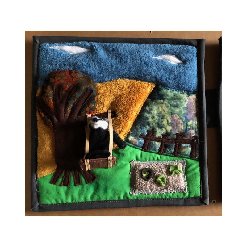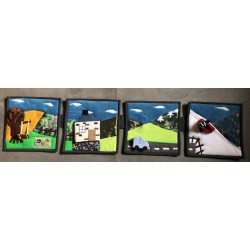 Livre-tableau de 4 pages en tissu. Chaque page mesure 28 cm sur 28 cm et est reliée à la suivante.