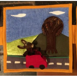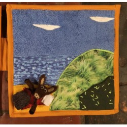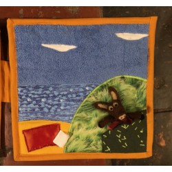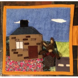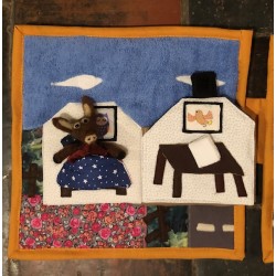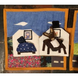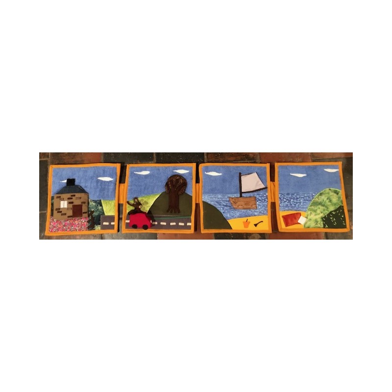 Livre-tableau de 4 pages en tissu. Chaque page mesure 28 cm sur 28 cm et est reliée à la suivante.