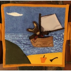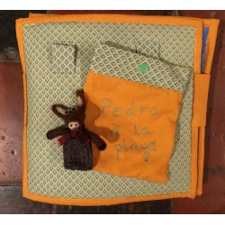 Le livre se replie mais peut aussi devenir un tableau tout en longueur en insérant des baguettes dans les passants à l'arrière du livre. Une pochette pour ranger Pedro
