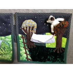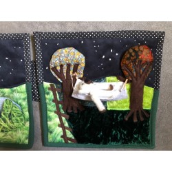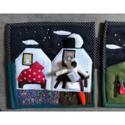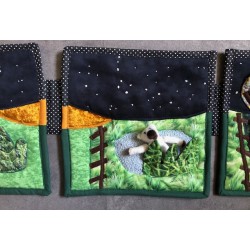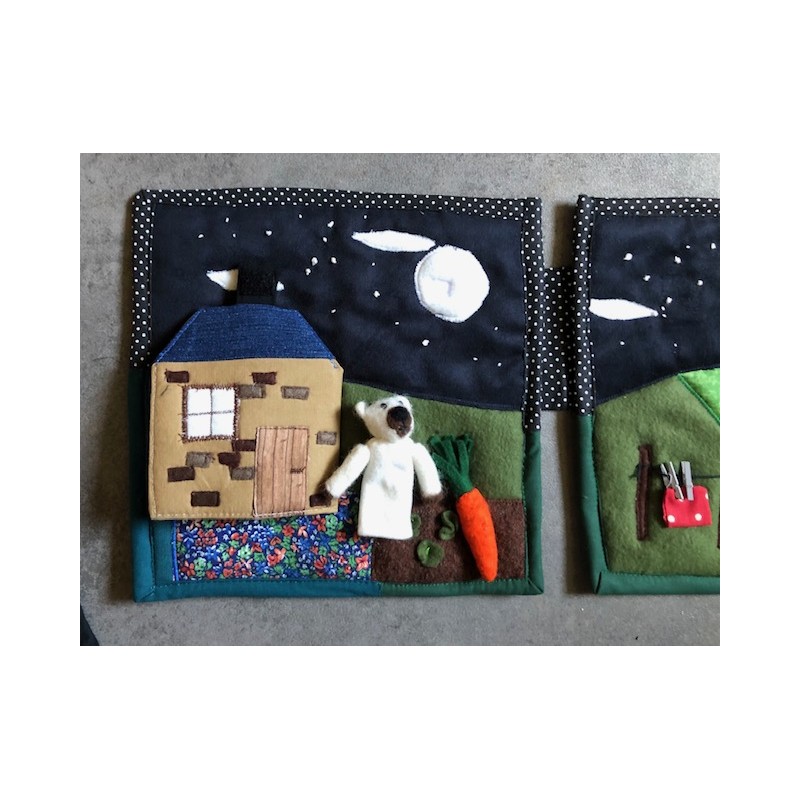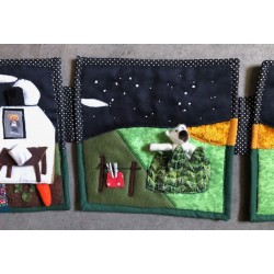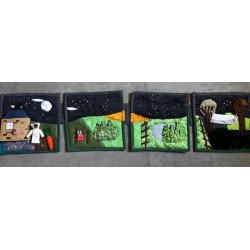 Livre-tableau de 4 pages en tissu. Chaque page mesure 28 cm sur 28 cm et est reliée à la suivante.