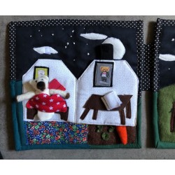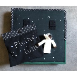 Chaque livre est unique. Un sac en tissu brodé pour ranger la marionnette.