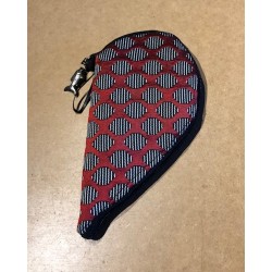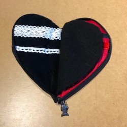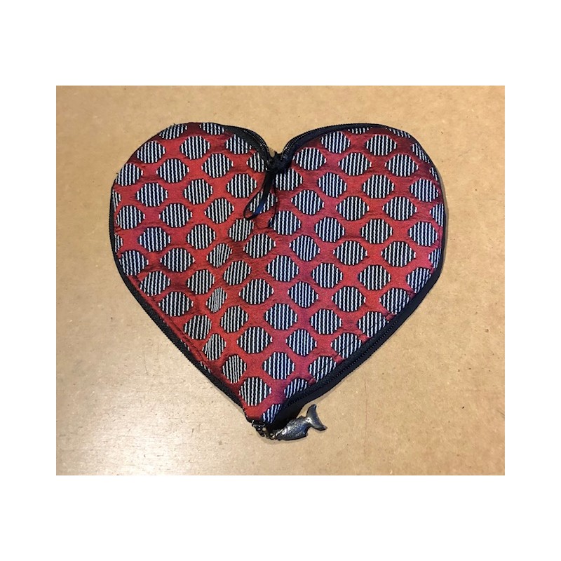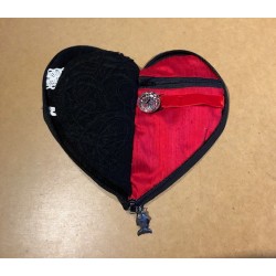 Etui en forme de coeur, recouvert de tissu " motifs gris sur fond rouge. Format 24 x 20 ouvert et 12 x20 fermé. Deux dentelles à gauche pour accrocher les boucles d'oreille. A droite, dans de la soie sauvage rouge une petite poche avec une fermeture à glissière pour y mettre les petits bijoux. Un lien maintenu avec un bouton pour y installer les bagues. Vos bijoux sont protégés par un tissu noir de laine bouillie et une fermeture à glissière noire ferme le cœur, qui peut se glisser dans votre valise. A la maison ou lors d'un voyage, vous pouvez suspendre le voyageur à bijou grâce à son cordon en forme d'anneau.