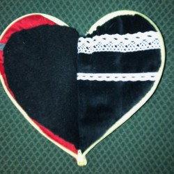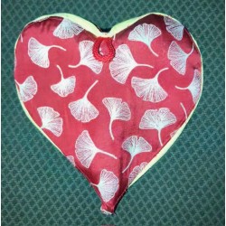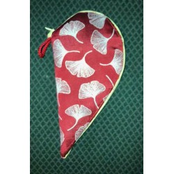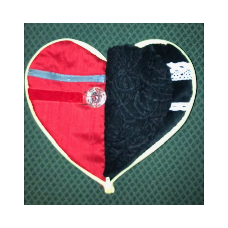 Etui en forme de coeur, recouvert de tissu " motifs jinko biloba rouge". Format 24 x 20 ouvert et 12 x20 fermé. Deux dentelles à droite pour accrocher les boucles d'oreille. A gauche, dans du tissu de soie sauvage, une petite poche avec une fermeture à glissière pour y mettre les petits bijoux. Un lien maintenu avec un bouton pour y installer les bagues. Vos bijoux sont protégés par un tissu noir de laine bouillie et une fermeture à glissière jaune clair ferme le cœur, qui peut se glisser dans votre valise. A la maison ou lors d'un voyage, vous pouvez suspendre le voyageur à bijou grâce à son cordon en forme d'anneau.